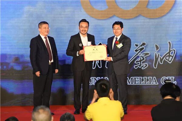 隋忠诚(右)向汪涵(中)颁授“湖南茶油推广大使”聘书。