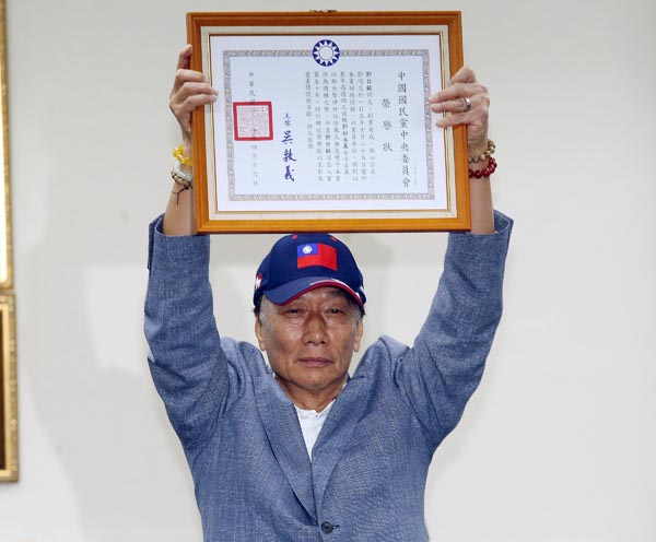 鴻海集團董事長郭台銘昨日獲頒國民黨榮譽狀,表態願意參加初選。中央社