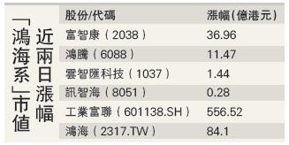 而在台灣上市的鴻海這兩天股價亦漲近2%,市值達1.27萬億新台幣,兩日市值增330億新台幣(約84.95億港元)。