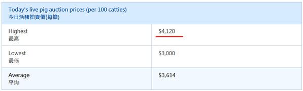 他還說:「以前香港一天殺4000多只豬,現在只殺1000多只,而且每100斤要4000多港元(折合約3590元人民币),難以減價銷售。他預計高豬價仍會維持一段長時間,謹慎估計到新年才會回落。」