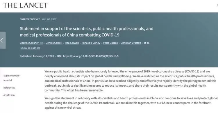 27名国际顶尖公共卫生科学家18日在知名医学期刊《柳叶刀》发表声明,强烈谴责“认为该新型冠状病毒疾病并非自然起源的阴谋论”,认为这样的阴谋论“除了制造恐慌、谣言、偏见、损害防疫工作外,别无他用”。该声明还称赞中国卫生专家工作“卓越”,并号召更多人签名支持。