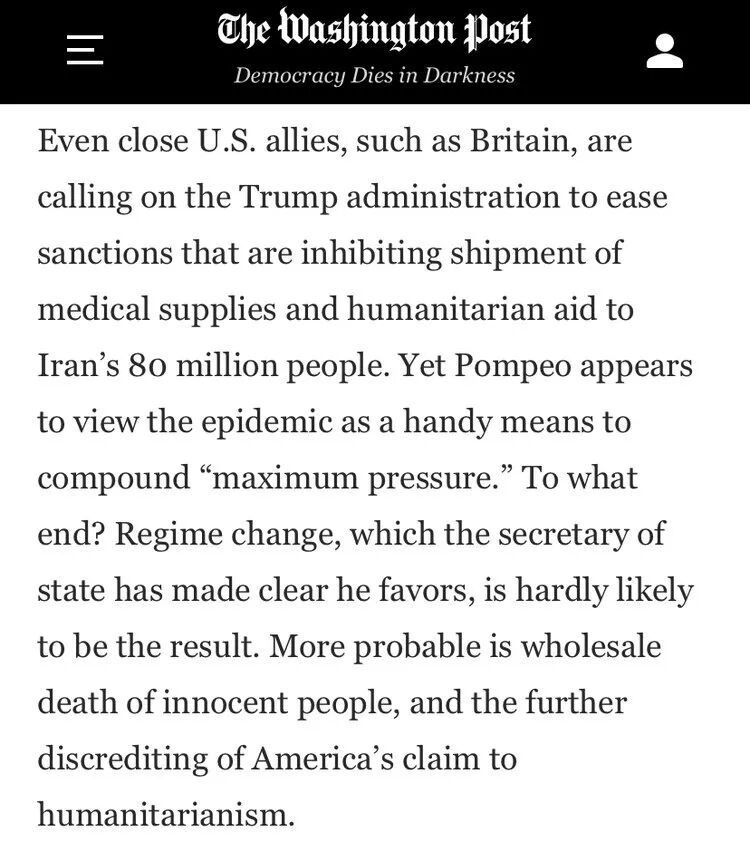 事实上,被蓬佩奥当作攻击靶子的不仅是中国。他还多次指责俄罗斯、伊朗等国有意散布美国政府抗疫的“假消息”。但正如《华盛顿邮报》在评论中指出的,在伊朗八千万民众面临人道主义援助困境之际,蓬佩奥等政客不顾英国等西方国家放松制裁的呼吁,将疫情视为深化“极限施压”的便利手段,可能导致大批无辜民众死亡,美国标榜的人道主义会更加不得人心。