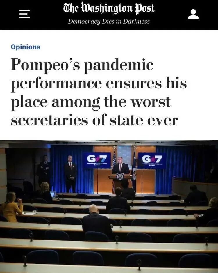 还有任何其他在紧急状况下表现更糟糕的国务卿吗?自二战以来,不可能想出比他更没有效率的国务卿了……他在疫情期间的表现将使其成为有史以来最糟糕的国务卿之一。”