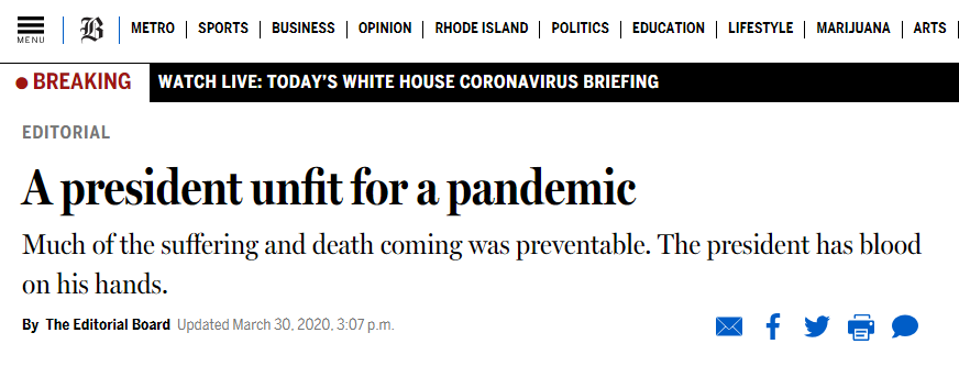《波士顿环球报》3月30日发表一篇社论,系统梳理了美国政府在应对新冠疫情中所犯的“错误”,包括未及时采取行动、将新冠病毒称为“中国病毒”加剧种族歧视、未能推动国际合作遏制疫情、拒绝接受顶级专家提出的建议和世卫组织推荐的检测方法等。社论认为,“许多苦难和死亡本可避免”,但“白宫的灾难性决定,使这个世界上最富有的国家注定要经历一段无法言喻的苦难日子”,直斥美国政府的手“沾满了鲜血”。