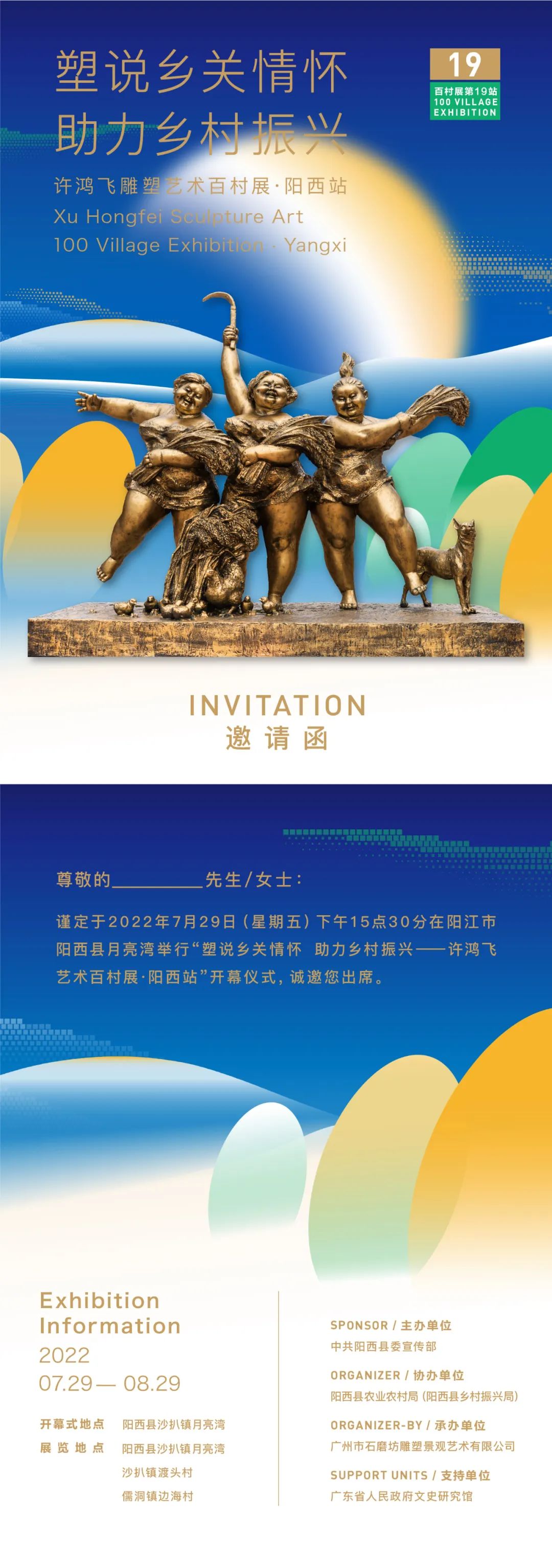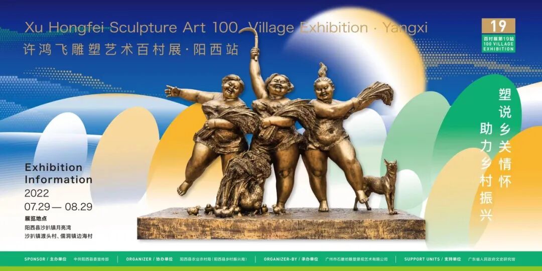 2022年7月29日至8月29日,以“塑说乡关情怀 助力乡村振兴”为主题的许鸿飞雕塑艺术百村展·阳西站将在阳江市阳西县沙扒镇月亮湾、沙扒镇渡头村、儒洞镇边海村举办。