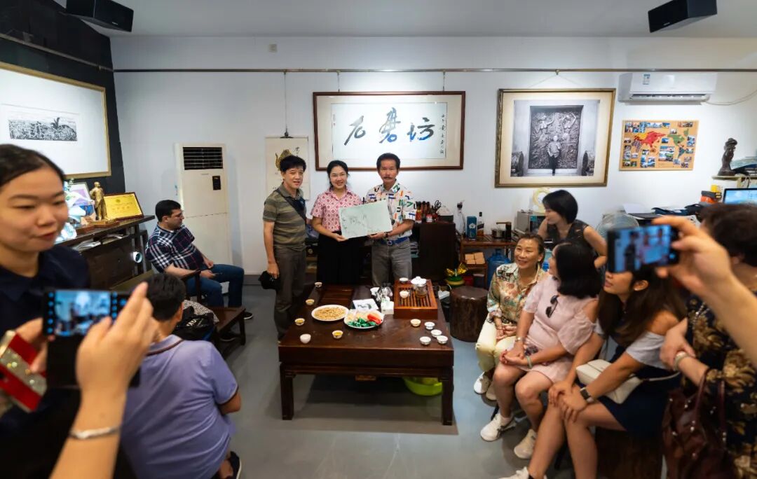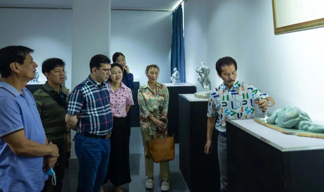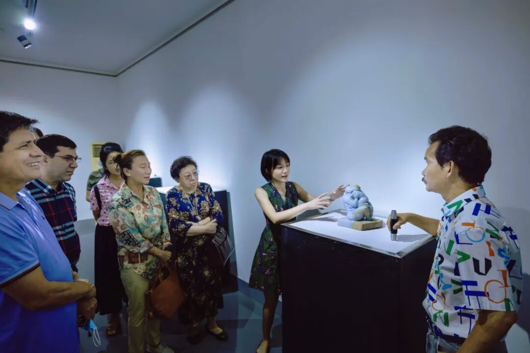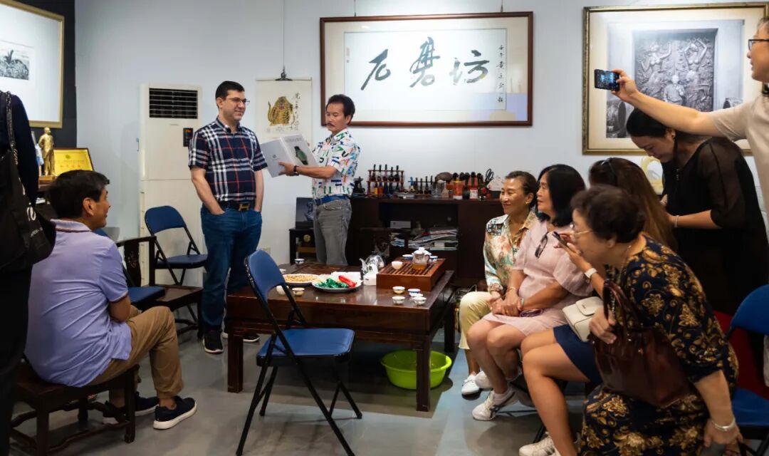 许鸿飞热情地接待了来访的外宾朋友们,并带领大家参观了陈列在工作室内不同题材、不同类型的雕塑作品,分享着作品的创作故事及在世界巡展中的轶闻趣事。