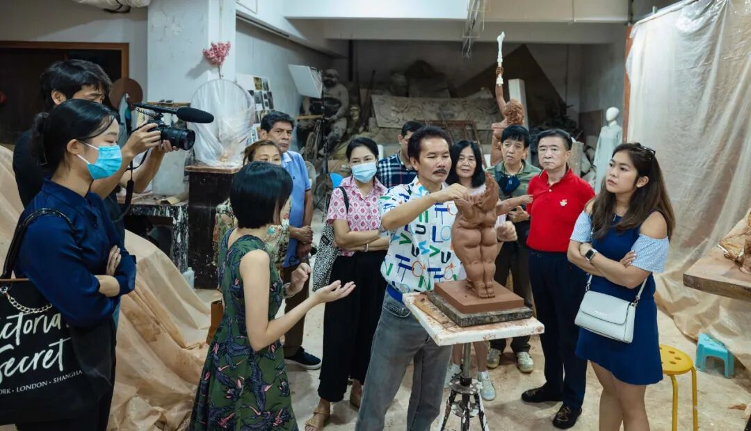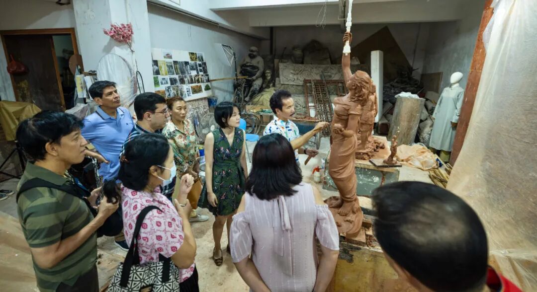 外宾朋友们对许鸿飞的作品饶有兴趣,一行人深入工作间,近距离欣赏正在创作中的作品,详细了解雕塑的创作流程。