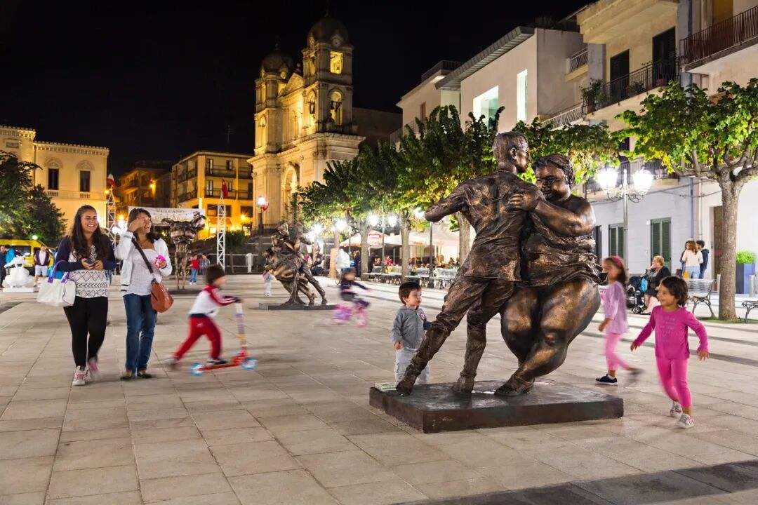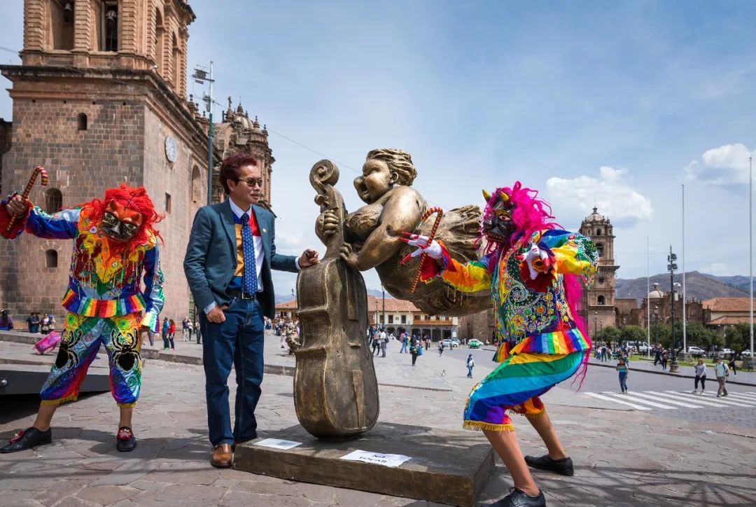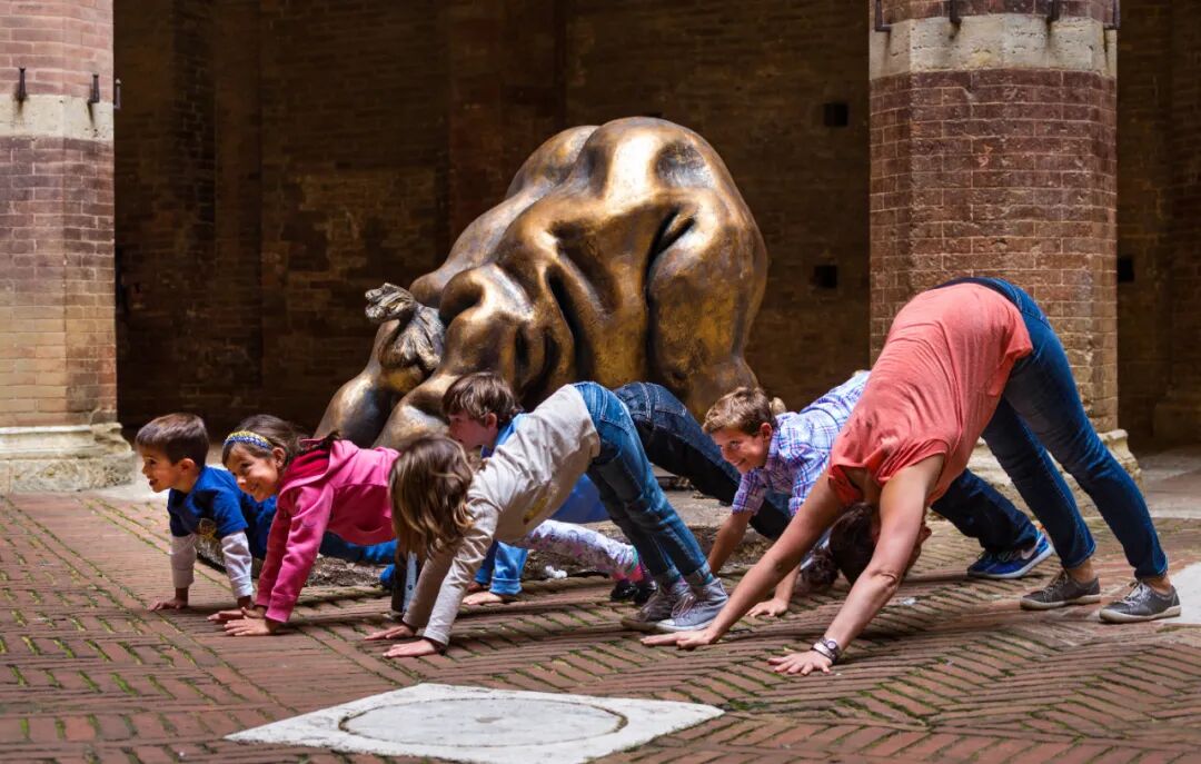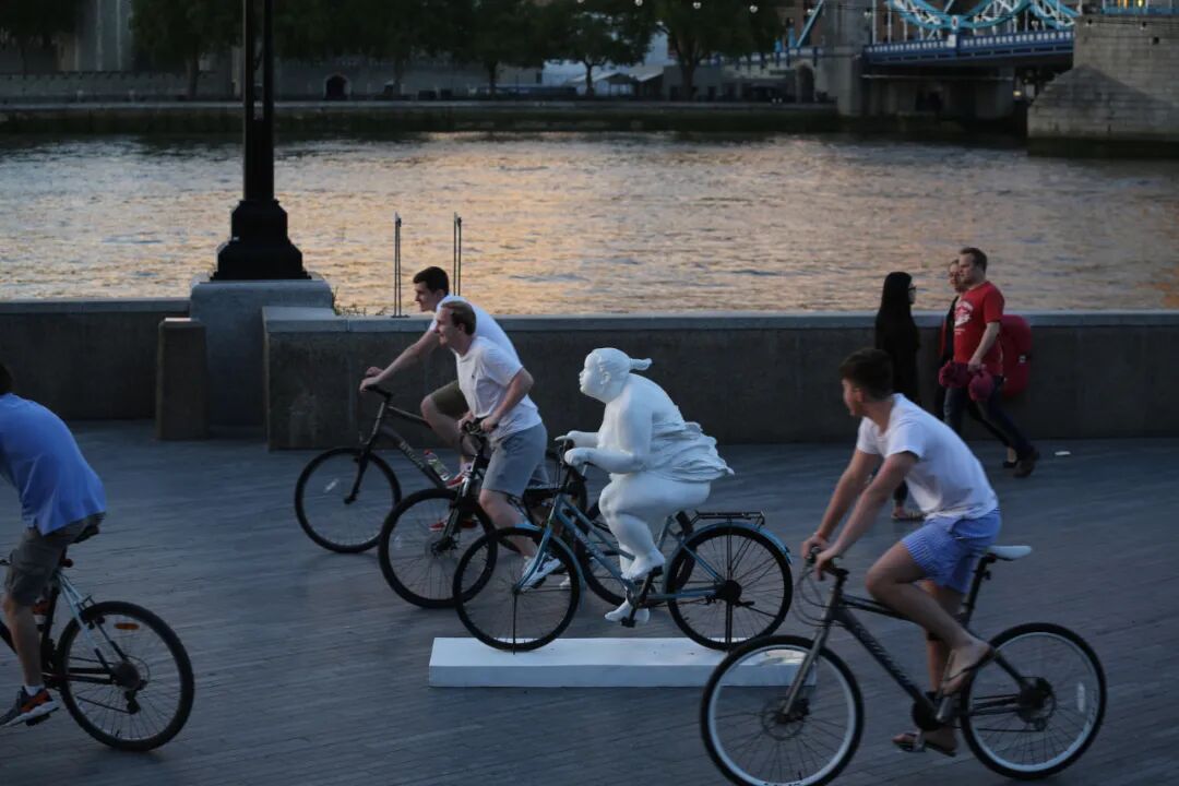 与以往美术馆内严肃的陈列方式大相径庭,艺术家不再采取艺术殿堂里有距离感的、仰视的展示方式,而是突破性地将他的大型雕塑拉到了户外露天的广场里,撤掉冰冷的玻璃罩,撕下警戒线,让雕塑与群众平视、交流。让两者毫无距离地拥抱、亲吻。他的展览在人流密集的标志性广场上立刻引来了围观、轰动。