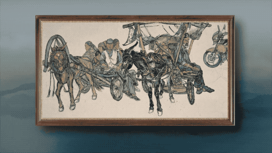 我画了两张尺寸很大的画作,一幅是《丝绸之路·赶车的人》,画中的马有真马这么大,人是真人这么大。我作画的时候,很有激情而且非常激动,用的是中国画的手法,借鉴了中国传统壁画,比如永乐宫壁画、敦煌壁画其中雄浑的笔法。