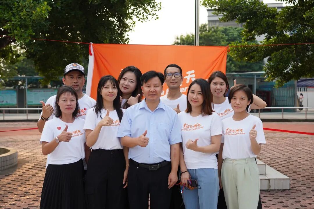 图说:志愿者与学校校长李绍勇合照