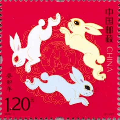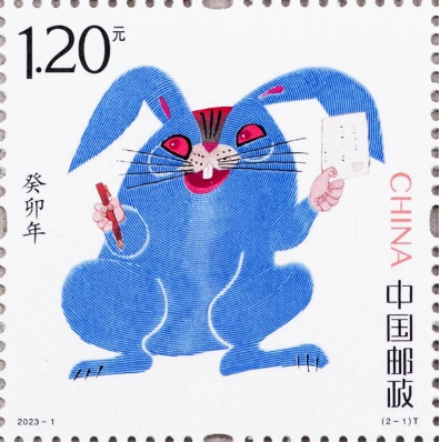 “癸卯寄福”用别出心裁的蓝色描绘了一只右手执笔、左手持信的睿智卯兔。这只俏皮的“蓝兔子”让广大邮迷爱不释手。其中,“蓝兔”与“蓝图”谐音,传递着艺术家对新春的美好祝愿。