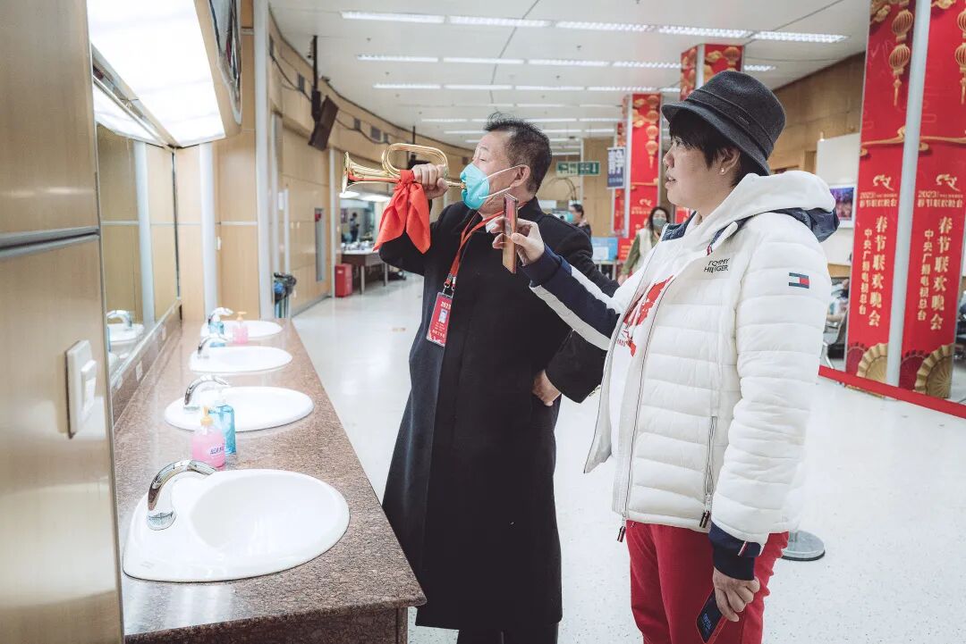 从一开始的“云排练”到最后的入台合练、联排,近两个月的时间,每个演员都对自己高标准、严要求,丝毫也不松劲儿。68岁的李春甫是第一个亮相的,开篇那个帅气的吹号大爷就是他,退休前他是中国国际航空公司的一名乘务员,年轻时还在空降兵某部当过八年指导员。也许正是当兵的经历,让他对待任何一个细节都一丝不苟。身姿怎么站会更挺拔,军号举起多少度更有美感,吹号用多大的劲儿才合适,他反复琢磨。没事儿就对着镜子练表情、纠姿势,一遍又一遍,尽管他的表演其实只有十几秒,认真的身影令主创团队感动不已。
