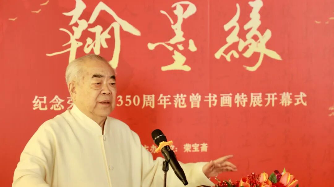 图:画家范曾在“翰墨缘——纪念荣宝斋350周年范曾书画特展”开幕式上讲话