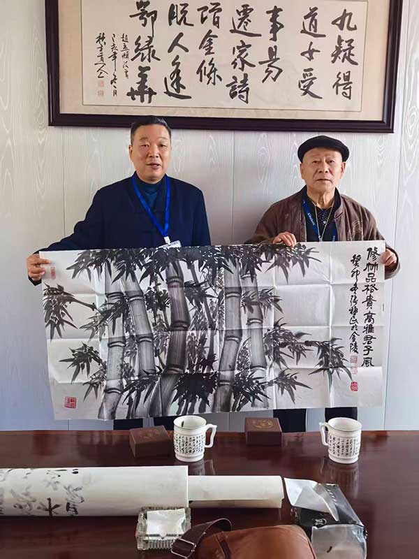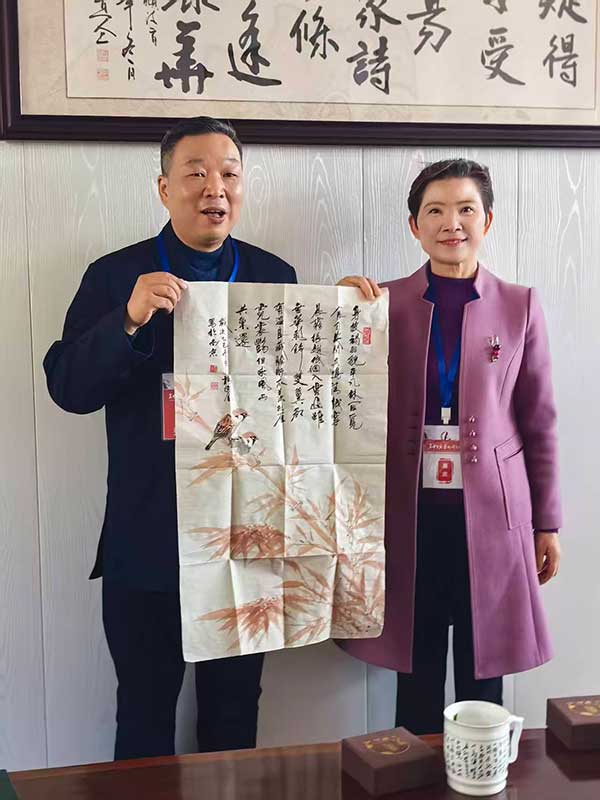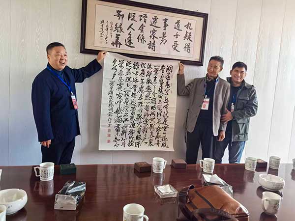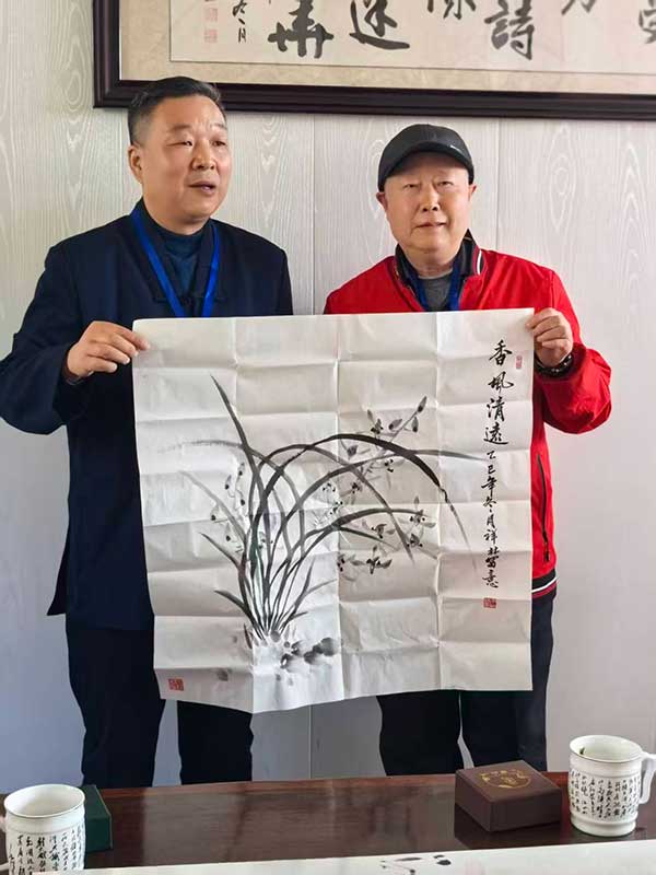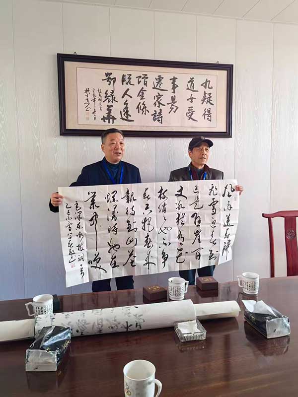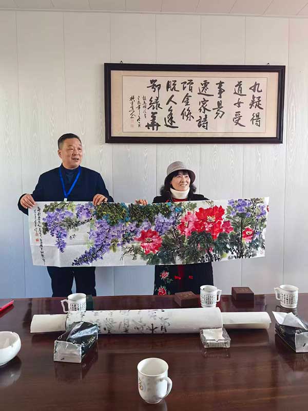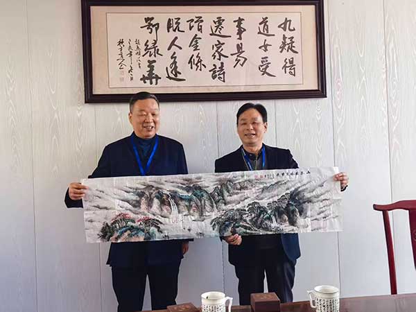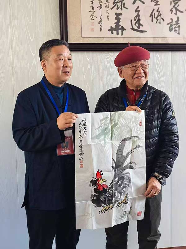 尤为温情的一幕是,与会书画家们将此行精心准备的墨宝郑重相赠予简道长,以感谢他长期的护持。艺术家们各献所长,呈现其个人最为纯熟的艺术风貌:既有气势沉雄的北派山水,也有清新雅致的没骨花鸟;笔下还有写意传神的人物画,书法作品则或录古典诗文,或书吉祥佳句,于笔墨流转间寄托着对清修圣地的美好祝愿,皆笔精墨妙,意趣盎然。这些凝聚了个人心血的代表作,不仅展现了画院同仁的艺术追求,更承载着一份深厚的情谊。简道长欣然接受这份独特的礼物,并表示这些风格多样的佳作,将为清修之地注入鲜活的艺术气息,成为道院与画院之间情谊的美好见证。