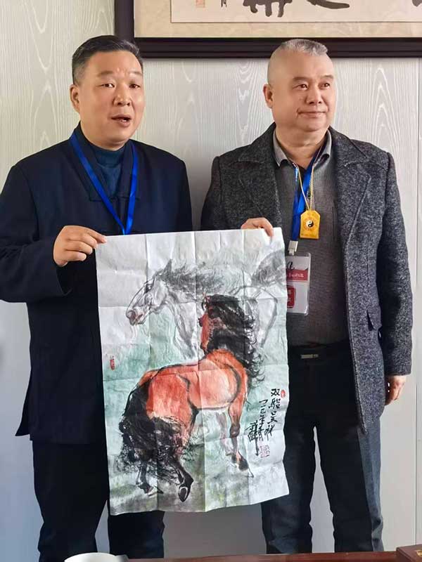 年会的热烈气氛在随后的即兴笔会中达到高潮。 书画家们意兴盎然,当即在会议厅内铺纸研墨,挥毫创作。但见书法家笔走龙蛇,或录道家经典,或书吉祥佳句;擅画骏马者,笔下生灵矫健奔放,颇具龙马精神;而人物画家则勾勒出高士隐逸的形神,古意盎然。现场佳作频出,浓厚的艺术气息弥漫在整个空间。