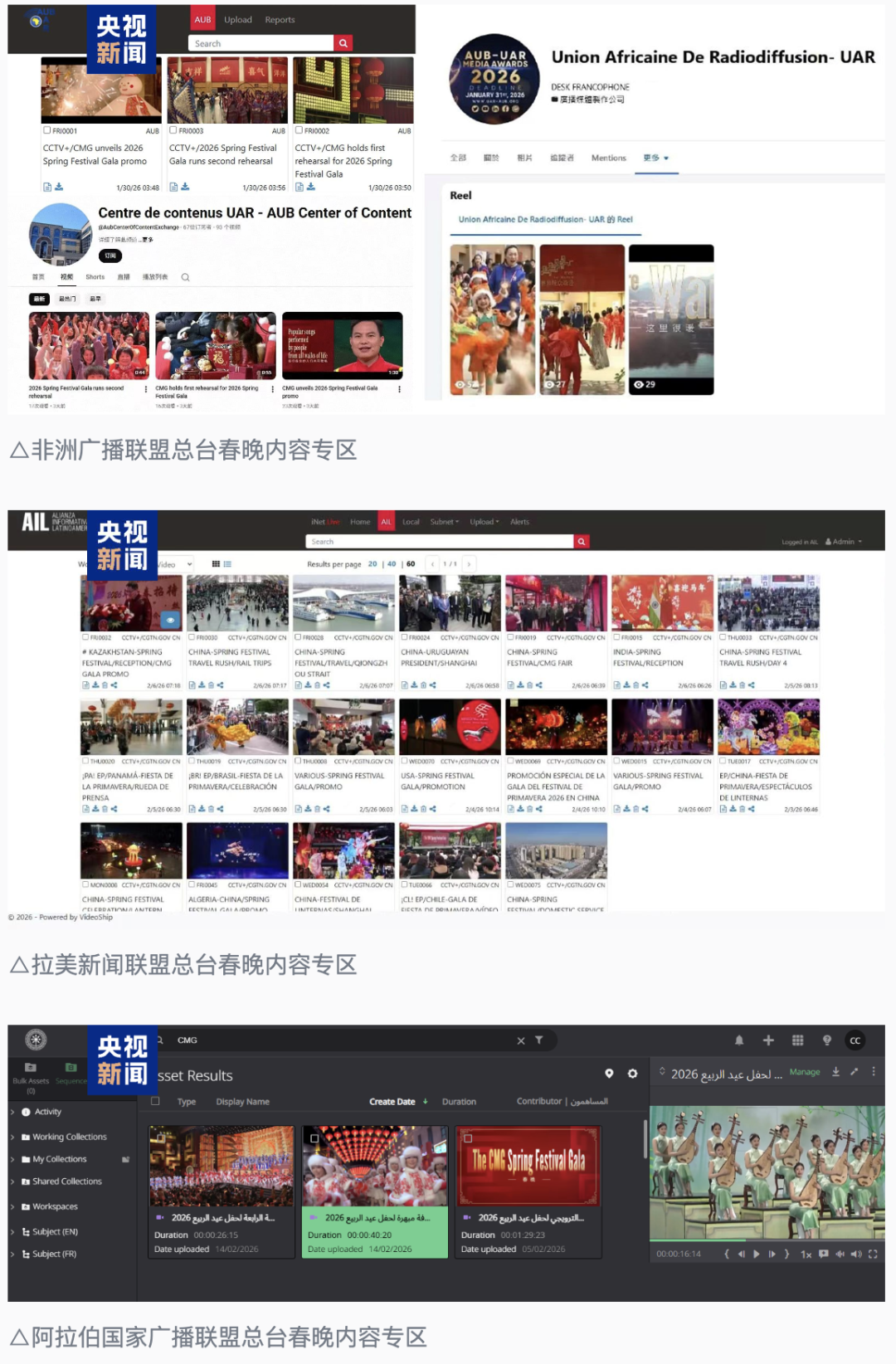与此同时,亚洲-太平洋广播联盟、非洲广播联盟、拉美新闻联盟、阿拉伯国家广播联盟、欧洲新闻交换联盟、伊斯兰合作组织国家广播电视联盟和加勒比广播联盟等七大新闻联盟,向全球受众集中推介总台马年春晚。