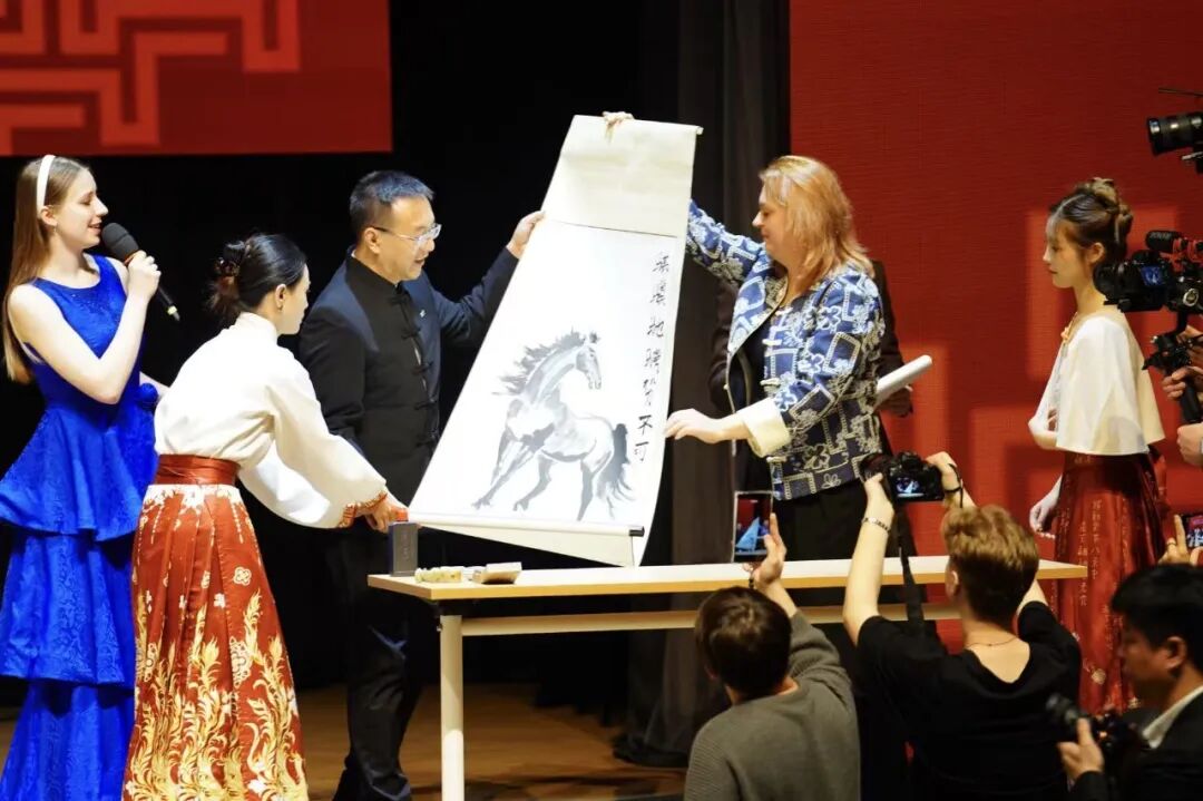 联合国专场上演“马跃元境,智织华裳”主题服装秀,将中国农历马年吉祥意象与人工智能科技美学相融合,打造一场传统与现代碰撞的跨界服装展演;法国专场上,大气磅礴的旗舞《万马奔腾》同法语童声朗诵《马踏晨光》交相呼应;新西兰专场上,中新两国艺术家倾情呈现器乐合奏《赛马》,24位表演者以中文“马”字行“飞花令”;俄罗斯专场上,著名画家安娜·顿琴科代表俄中友协向总台赠送以马年为主题的中国画作品;埃及专场则邀请中外嘉宾共同登台参与“马年画马”。
